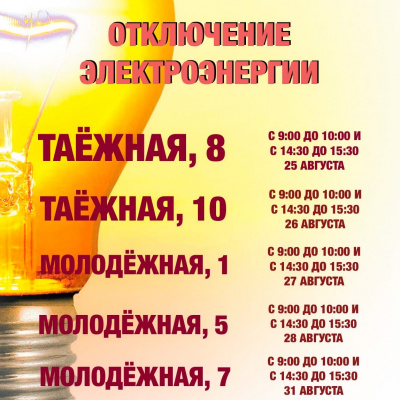 Таёжная, 10 - с 9:00 до 10:00 и с 14:30 до 15:30 26 августа