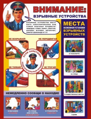 Во всех перечисленных случаях: - не трогайте, не передвигайте, не вскрывайте обнаруженный предмет; - зафиксируйте время обнаружения предмета; - постарайтесь сделать все возможное, чтобы люди отошли как можно дальше от находки; - обязательно дождитесь прибытия оперативно-следственной группы (помните, что вы являетесь очень важным очевидцем); Помните: внешний вид предмета может скрывать его настоящее назначение. В качестве камуфляжа для взрывных устройств используются самые обычные бытовые предметы: сумки, пакеты, коробки, игрушки и т.п. Родители! Вы отвечаете за жизнь и здоровье ваших детей. Разъясните детям, что любой предмет найденный на улице или в подъезде, может представлять опасность. Не предпринимайте самостоятельно никаких действий с находками или подозрительными предметами, которые могут оказаться взрывными устройствами - это может привести к их взрыву, многочисленным жертвам и разрушениям. Получение информации об эвакуации Сообщение об эвакуации может поступить не только в случае обнаружения взрывного устройства и ликвидации последствий террористического акта, но и при пожаре, стихийном бедствии и т.п. Получив сообщение от представителей властей или правоохранительных органов о начале эвакуации, соблюдайте спокойствие и четко выполняйте их команды. Если вы находитесь в квартире, выполните следующие действия: - Возьмите личные документы, деньги, ценности; - Отключите электричество, воду и газ; - Окажите помощь в эвакуации пожилых и тяжело больных людей; - Обязательно закройте входную дверь на замок – это защитит квартиру от возможного проникновения мародеров. - Не допускайте паники, истерики и спешки. Помещение покидайте организованно. Возвращайтесь в покинутое помещение только после разрешения ответственных лиц. Помните, что от согласованности и четкости ваших действий будет зависеть жизнь и здоровье многих людей. Поведение в толпе - Избегайте больших скоплений людей. - Не присоединяйтесь к толпе, как бы ни хотелось посмотреть на происходящие события. - Если оказались в толпе, позвольте ей нести Вас, но попытайтесь выбраться из неё. - Глубоко вдохните и разведите согнутые в локтях руки чуть в стороны, чтобы грудная клетка не была сдавлена. - Стремитесь оказаться подальше от высоких и крупных людей, людей с громоздкими предметами и большими сумками. - Любыми способами старайтесь удержаться на ногах. - Не держите руки в карманах. - Двигаясь, поднимайте ноги как можно выше, ставьте ногу на полную стопу, не семените, не поднимайтесь на цыпочки. - Если давка приняла угрожающий характер, немедленно, не раздумывая, освободитесь от любой ноши, прежде всего от сумки на длинном ремне и шарфа. - Если что-то уронили, ни в коем случае не наклоняйтесь, чтобы поднять. - Если Вы упали, постарайтесь как можно быстрее подняться на ноги. При этом не опирайтесь на руки (их отдавят либо сломают). Старайтесь хоть на мгновение встать на подошвы или на носки. Обретя опору, "выныривайте", резко оттолкнувшись от земли ногами. - Если встать не удается, свернитесь клубком, защитите голову предплечьями, а ладонями прикройте затылок. - Попав в переполненное людьми помещение, заранее определите, какие места при возникновении экстремальной ситуации наиболее опасны (проходы между секторами на стадионе, стеклянные двери и перегородки в концертных залах 