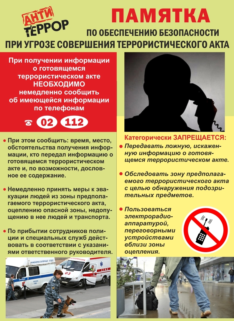 РЕКОМЕНДАЦИИ ГРАЖДАНАМ ПО ДЕЙСТВИЯМ ПРИ УГРОЗЕ СОВЕРШЕНИЯ ТЕРРОРИСТИЧЕСКОГО АКТА